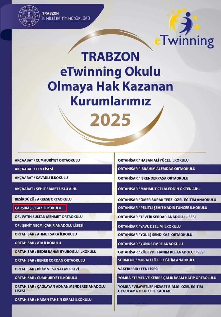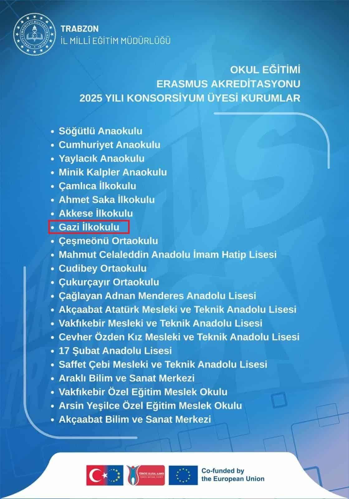 2025 Erasmus Akreditasyonu ve eTwinning kapsamında, Trabzon İl Millî Eğitim Müdürlüğü konsorsiyumuna katılmaya hak kazanan Gazi İlköğretim Okulu'nun değerli idarecilerini ve öğretmenlerini tebrik ederiz.